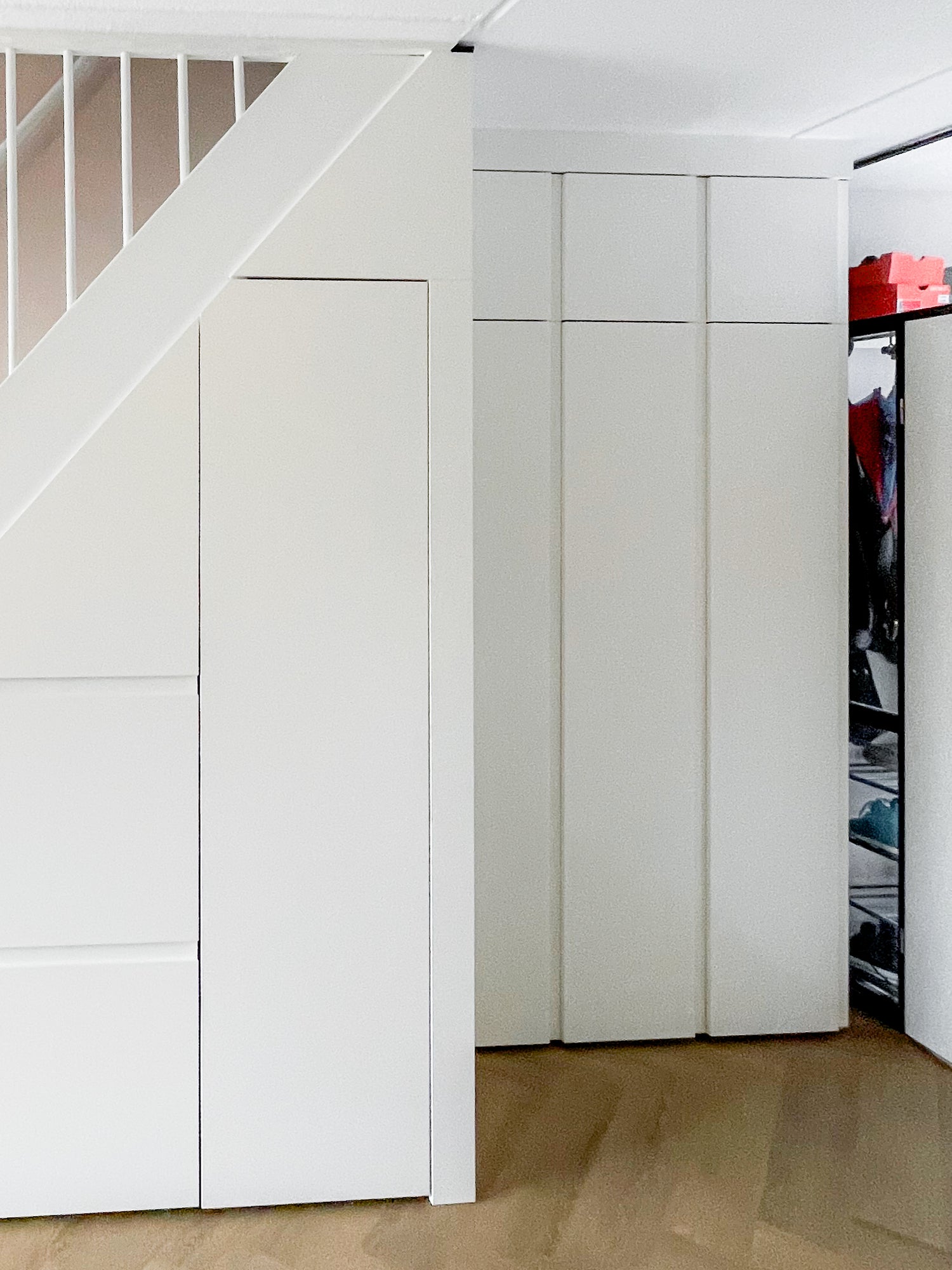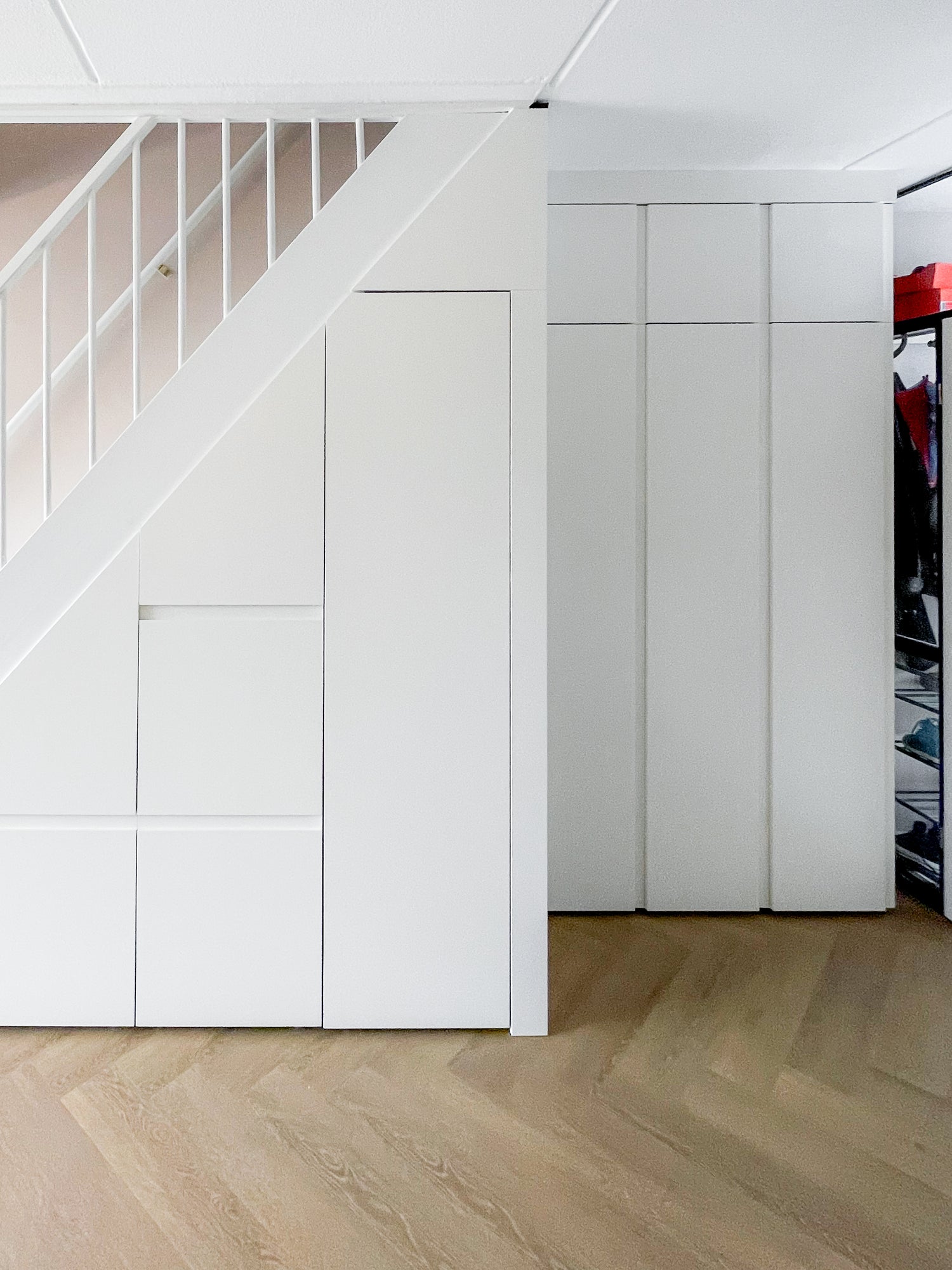 Onze monteurs konden de trap op de dag van de installatie eenvoudig dichtmaken. Links ontwierpen onze ontwerpers een schoenenkast met diepe lades en rechts een garderobekast voor jassen en kleding.